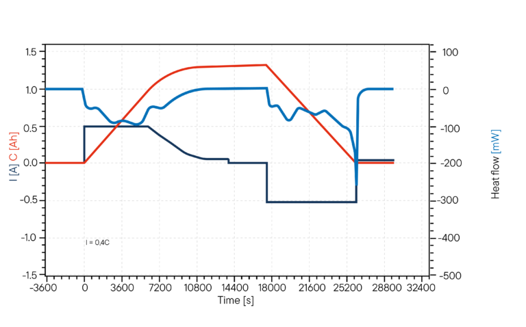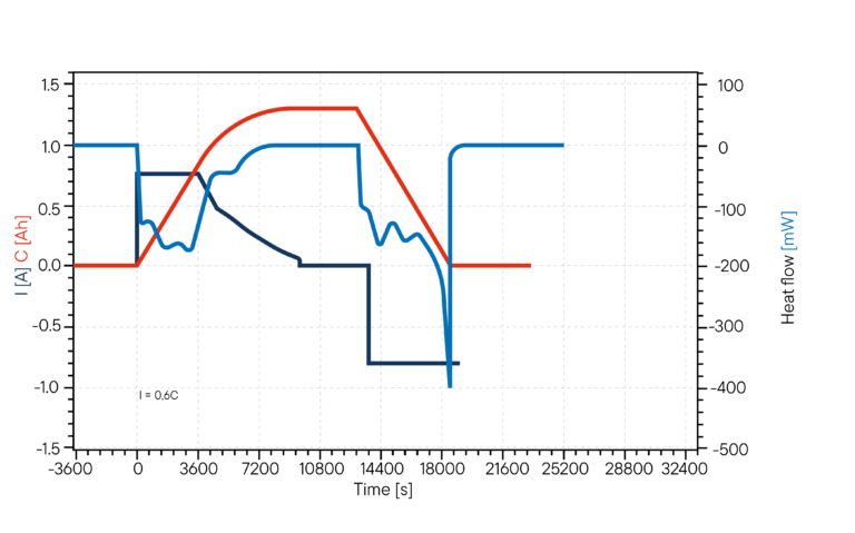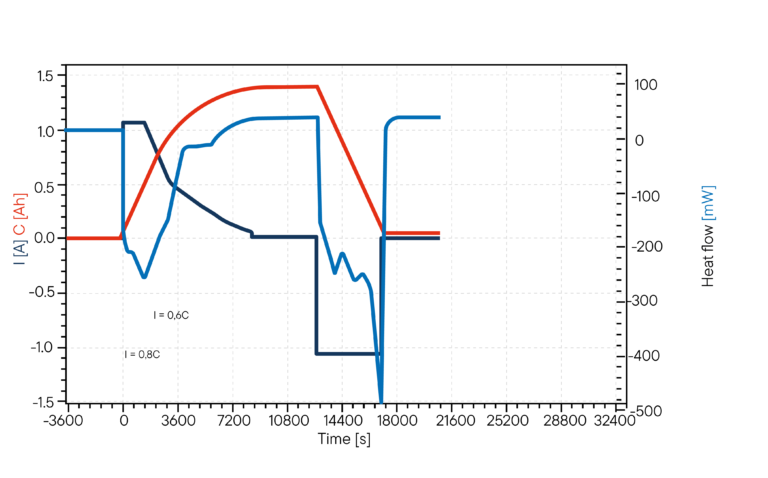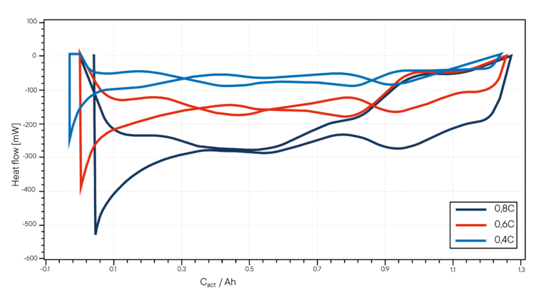 Przepływ ciepła przez ogniwo standardowego akumulatora litowo-jonowego przy różnych prądach ładowania i rozładowania. Pozwala to na wyświetlenie różnic w wydajności różnych parametrów ładowania w zależności od pojemności akumulatora. Istotnym tutaj jest na przykład różna pojemność resztkowa w zależności od różnych parametrów rozładowania. Widoczny jest również znaczny wzrost przepływu ciepła przy wyższych prądach ładowania i rozładowania.