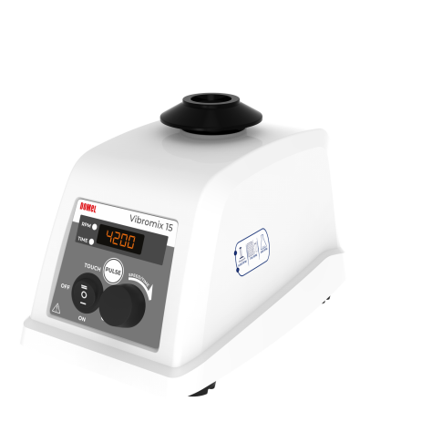 Prędkość mieszania jest płynnie regulowana w całym zakresie, a tryb pracy może być ustawiony jako czasowy lub ciągły. Zarówno czas, jak i prędkość ustawiane są cyfrowo. Konfiguracja parametrów jest prosta dzięki zastosowaniu jednego pokrętła enkodera, a ustawione wartości prezentowane są na wyświetlaczu cyfrowym. Niewielkie wymiary urządzenia sprawiają, że Vibromix 15 może być używany praktycznie wszędzie, również w środowiskach z kontrolowaną temperaturą w zakresie od 4°C do 65°C. Trójpozycyjny przełącznik (Touch, praca ciągła, tryb czuwania) zapewnia wyjątkową wygodę użytkowania.