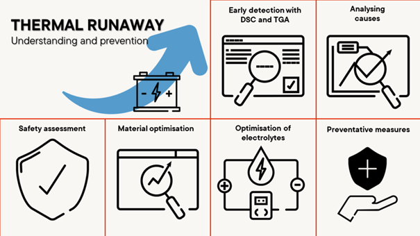 Zaawansowane instrumenty analityczne są wykorzystywane do analizy właściwości termicznych materiałów akumulatorowych. Laserowy analizator błyskowy (LFA), mostek gorący (THB) i okresowe ogrzewanie laserowe (PLH).